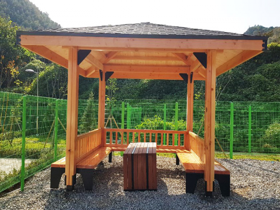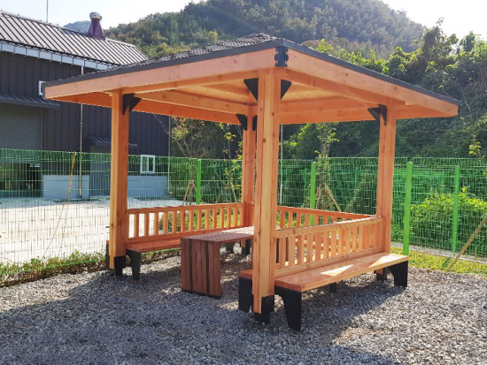 벤치 : 다그라스 스틸 복합구조지붕내부 : 사스나루바벤치크기 : 양면 : 폭 830 x 길이 2720 x 높이 : 450테이블크기 : 1580x750xh720